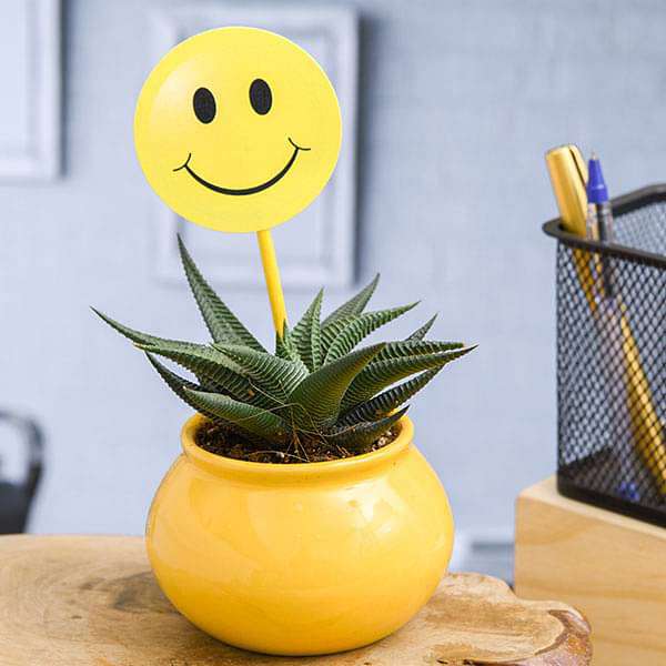 Haworthia Plant in Ceramic Handi with Smiley Flag