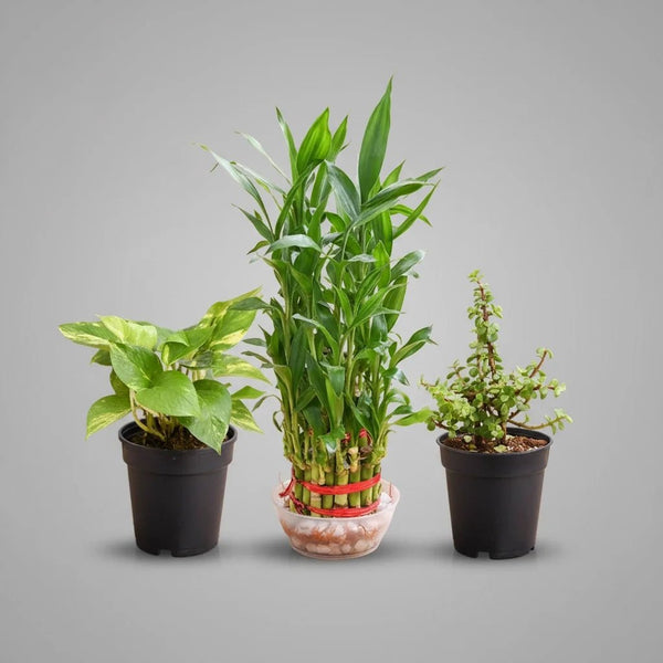 Our collection features a Jade Plant, a 3 Layer Lucky Bamboo, and a Money Plant, all housed in stylish Ronda planters. Each plant is known for its unique benefits, making this set a perfect addition to your Lohri celebrations or as a year-round good luck charm.