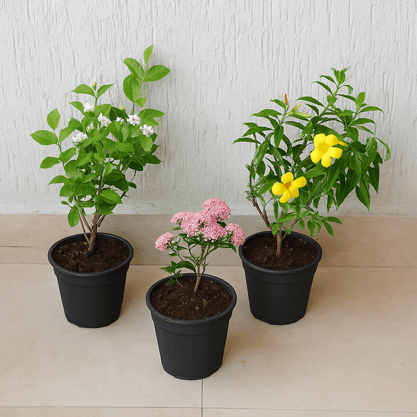 Transform your outdoor space into a vibrant oasis with our Set of 3 Outdoor Flowering Plants. This carefully curated collection includes the enchanting Jasminum sambac (Mogra), the cheerful Bush Allamanda in yellow, and the charming Ixora Mini Dwarf, perfect for adding color and fragrance to your garden. Each plant comes with its own 6-inch grower pot, ensuring a stylish and cohesive look.