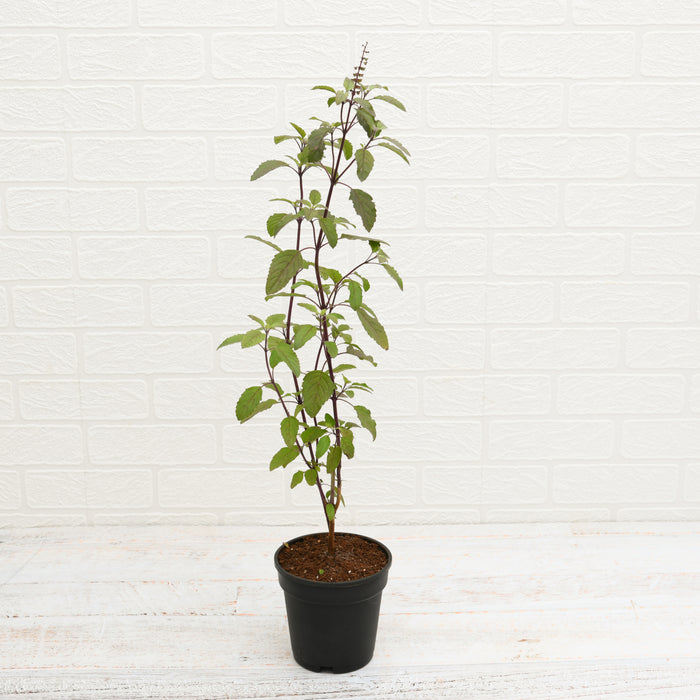 The Krishna Tulsi Plant, also known as Ocimum sanctum, is a revered herb in Hindu culture, celebrated for its spiritual significance and medicinal properties. This 6-inch (15 cm) pot is perfect for home gardens, balconies, or indoor spaces, allowing you to enjoy the aromatic leaves and their numerous health benefits. With its vibrant green leaves and purple stems, this plant not only enhances your living space but also purifies the air.
